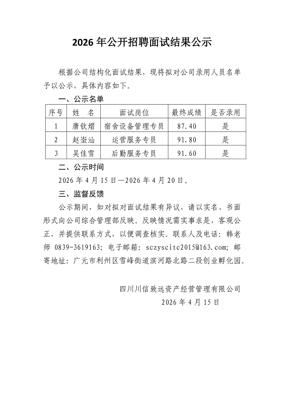 2026年公开招聘面试结果公示